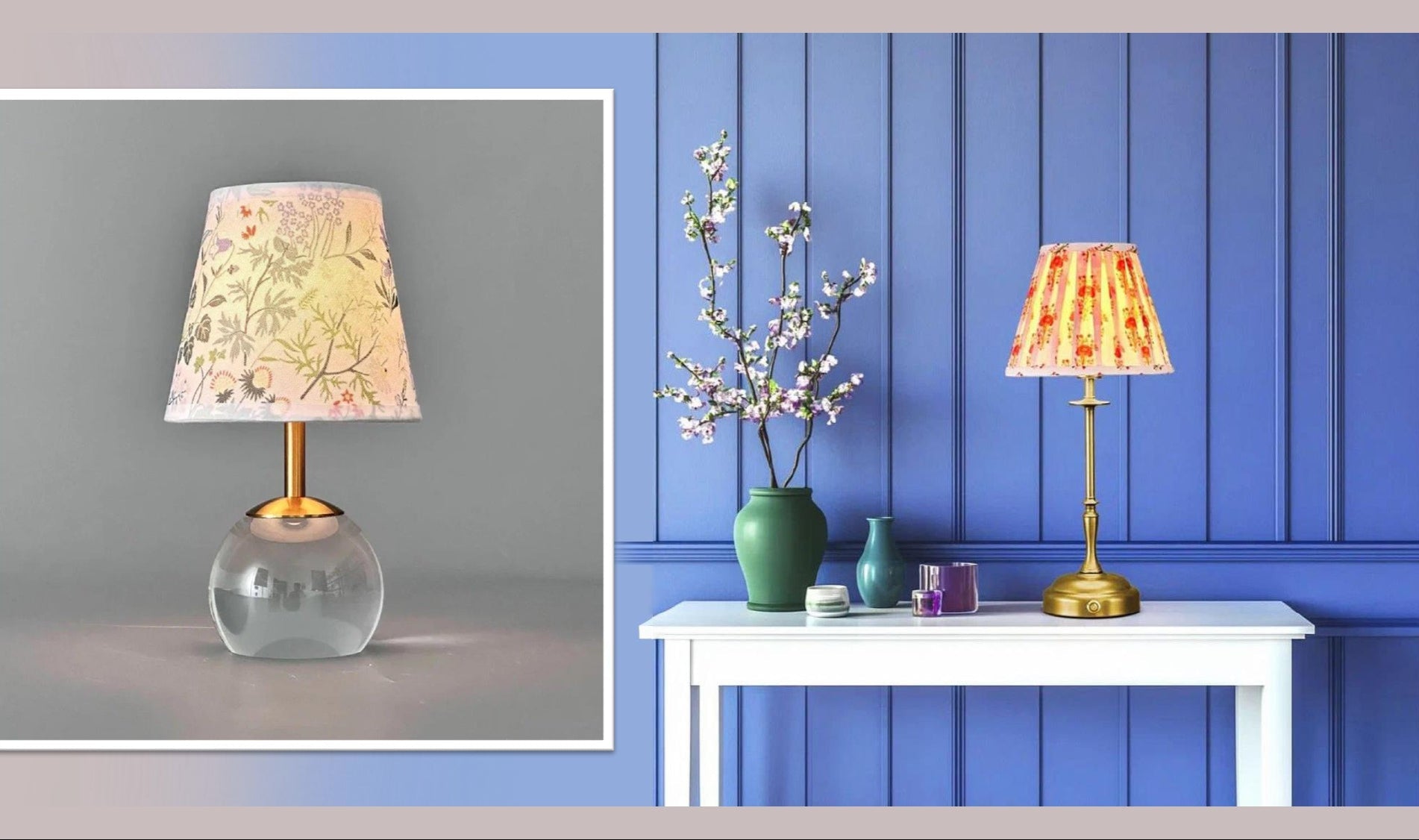 Goldene Tischlampe mit Stoffschirm, dimmbar