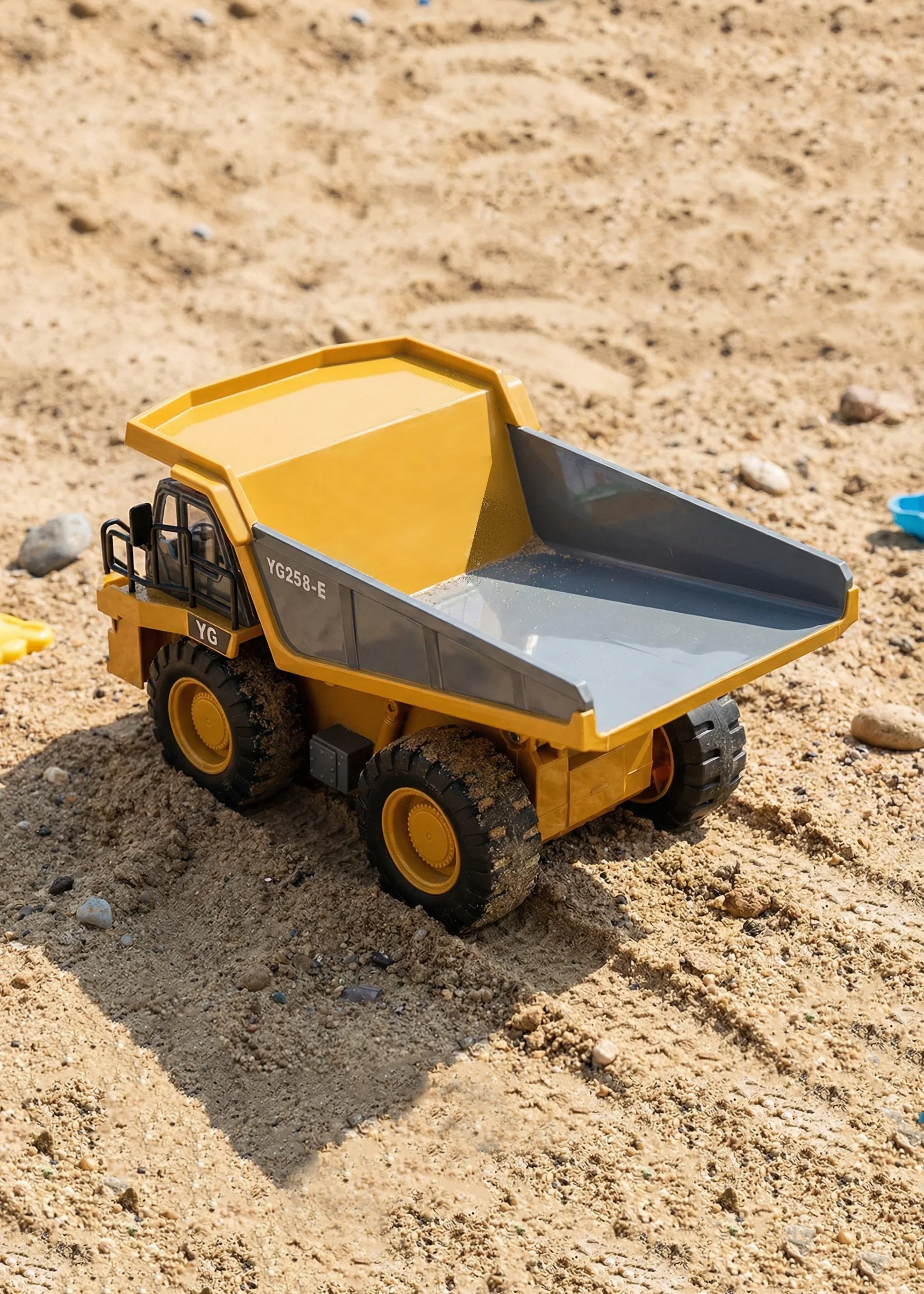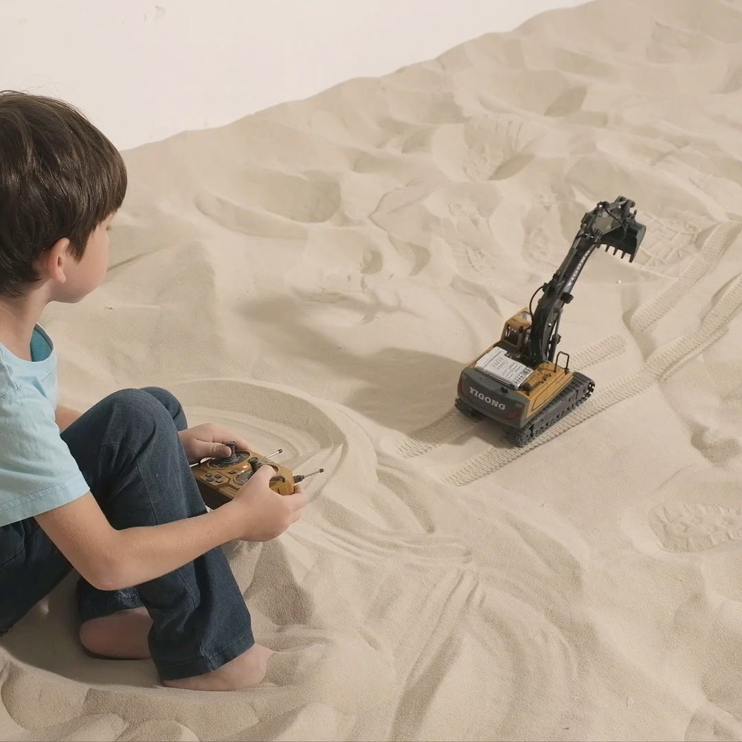 Funktionierende Kippmulde: Die Mulde lässt sich per Knopfdruck auf der Fernbedienung heben und senken, um Schuttgut, Sand oder Spielzeugsteine mühelos abzuladen.