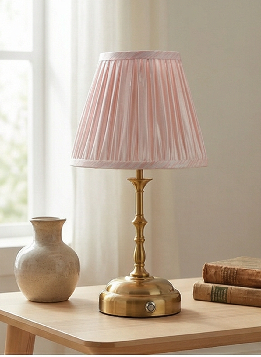 Stilvolle Tischlampe mit goldenem Fuß und dekorativem Stoffschirm. Die Lampe verfügt über einen eingebauten Akku und kann kabellos bis zu 24 Stunden genutzt werden. Mit der dreistufigen Touch-Dimmung schaffen Sie jederzeit die perfekte Atmosphäre – ideal für Wohnzimmer, Schlafzimmer oder Restaurants.